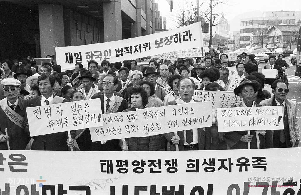 - 1990년 3월 26일 오후1시 일본 정부를 상대로 일제때 강제징용 징병으로 끌려가 희생된 한국인들에 대한 손해배상 소송을 준비중인 태평양전쟁 희생자유족회는 서울 종로구 중학동 한국일보사 12층 송현클럽 강당에서 희생자 유가족 및 참전자 등 6백여명이 참석한 가운데 태평양전쟁 희생자 유족 보상을 위한 재판 설명회를 갖고 있다. 참석자는 재판 설명회가 끝난 오후4시 일본대사관앞으로 몰려가 항의시위를 벌였다.