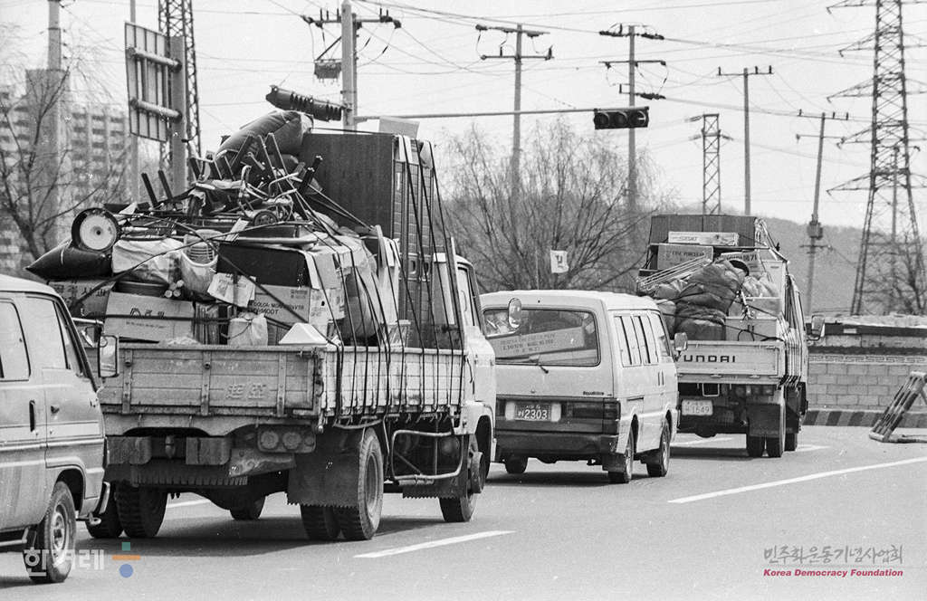 - 1990년 3월 21일 이삿짐을 용달차에 싣고 낯선 곳을 찾아가는 집없는 사람들. 자질구레한 짐보퉁이 사이로 스며드는 바람이 시름에 잠긴 이들의 뻥뚫린 가슴을 훑고 지나간다.