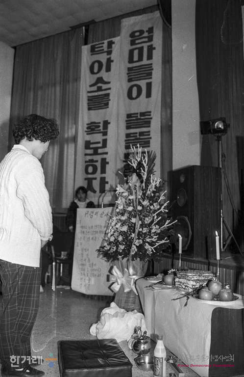 - 1990년 3월 25일 지난 9일 엄마 아빠가 일터에 나간 사이 문이 잠긴 단칸 지하셋방에서 불이 나 질식해 숨진 권혜영, 권용철 오누이의 영혼을 기리는 행사가 서울 영등포구 당산동 성문빡교회에서 열려 여성단체 회원들을 비롯한 시민 4백여명이 참석해 위령제를 하고 있다.