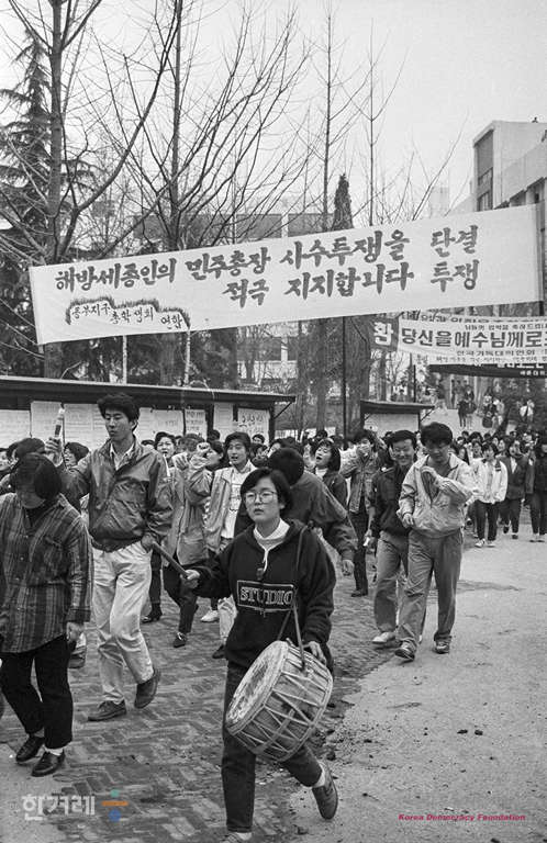 - 1990년 3월 27일 한 대학 두 총장 문제로 진통을 겪고 있는 세종대 학생들이 교원징계위원회에 회부된 오영숙교수의 징계위 개최와 관련해서 민주총장 사수집회를 하고 있다.