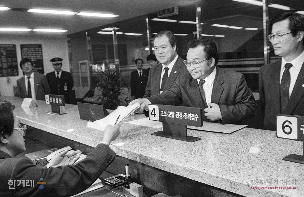 - 1990년 3월 28일 민주당(가칭) 김광일 장석화의원과 장기욱 전 의원이 노태우 대통령에 대한 국회의원 선거법 등 위반 고발장을 서울지검 민원실에 접수시키고 있다.