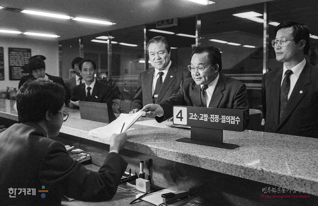 - 1990년 3월 28일 민주당(가칭) 김광일 장석화의원과 장기욱 전 의원이 노태우 대통령에 대한 국회의원 선거법 등 위반 고발장을 서울지검 민원실에 접수시키고 있다.