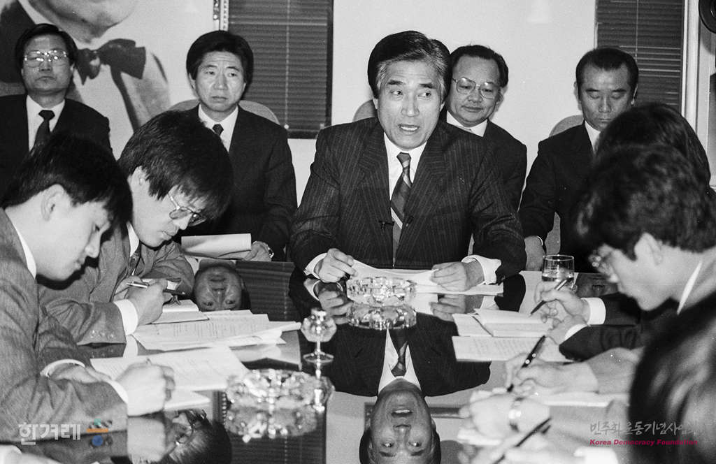 - 1990년 3월 30일 이기택 민주당 창당준비위원장이 중앙당사에서 기자회견을 갖고 민자당의 일당독주 저지를 위한 범국민기구 결성을 제안하고 있다.