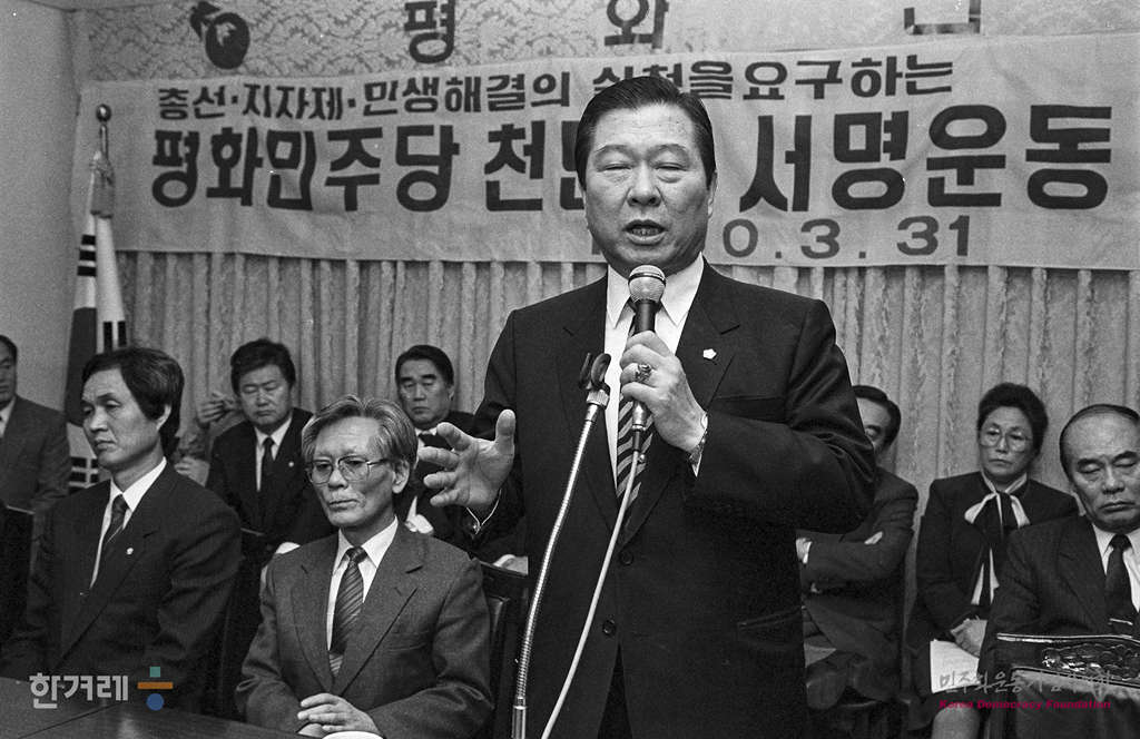 - 1990년 3월 31일 평민당 김대중총재가 서울 여의도 당사에서 열린 총선 지자체 민생해결을 요구하는 1천만 서명운동본부 발대식에서 서명운동으로 제2의 6.29선언을 획들하는 내용의 인사말을 하고 있다.