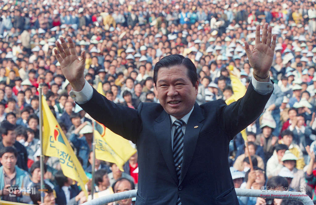 - 1990년 4월 1일 김대중 평민당 총재가 경기도 부천에서 국정보고대회 강연을 하기 위해 행사장으로 입장하고 있다. 이날 김총재는 청와대쪽의 여야영수 접촉제의와 관련 노태우대통령이 지난해 4당 합의사항인 정당추천제 등을 보장하는 지자체선거법 제정을 약속한다면 노대통령과 만날 뜻이 있음을 밝혔다.
