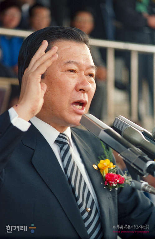- 1990년 4월 1일 김대중 평민당 총재가 경기도 부천에서 국정보고대회 강연을 하기 위해 행사장으로 입장하고 있다. 이날 김총재는 청와대쪽의 여야영수 접촉제의와 관련 노태우대통령이 지난해 4당 합의사항인 정당추천제 등을 보장하는 지자체선거법 제정을 약속한다면 노대통령과 만날 뜻이 있음을 밝혔다.