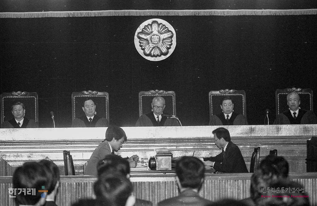 - 1990년 4월 2일 주규광 헌법재판소장이 장대현씨를 비롯한 대우조선 노동자 3명이 국가보안법 찬양고무 조항에 대해 국가의 안전이나 자유민주적 기본질서를 해치지 않는 한 단순히 반국가단체나 그 구성원을 고무 찬양 동조한 행위해 대해서는 국가보안법으로 처벌할 수 없다는 한정 합헌 결정문을 낭독하고 있다.