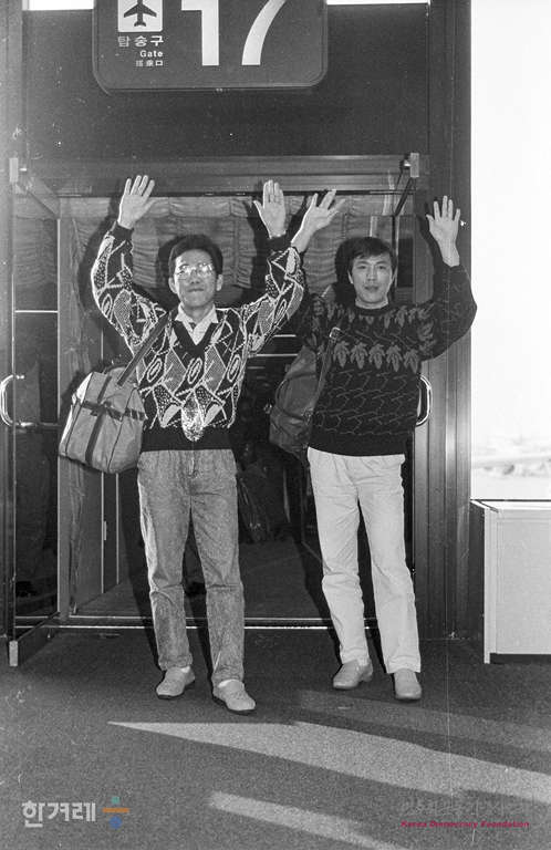- 1990년 4월 2일 소련 레닌그라드대학 자동기술학부 전자계산기학과에 재학중인 북한유학생 남명철씨와 박철진씨가 대한항공 902편으로 김포공항에 도착해 손을 들어 인사를 하고 있다. 이들은 지난달 25일 소련을 출발 독일을 거쳐 프랑스 주재 한국대사관에 망명을 요청했다.