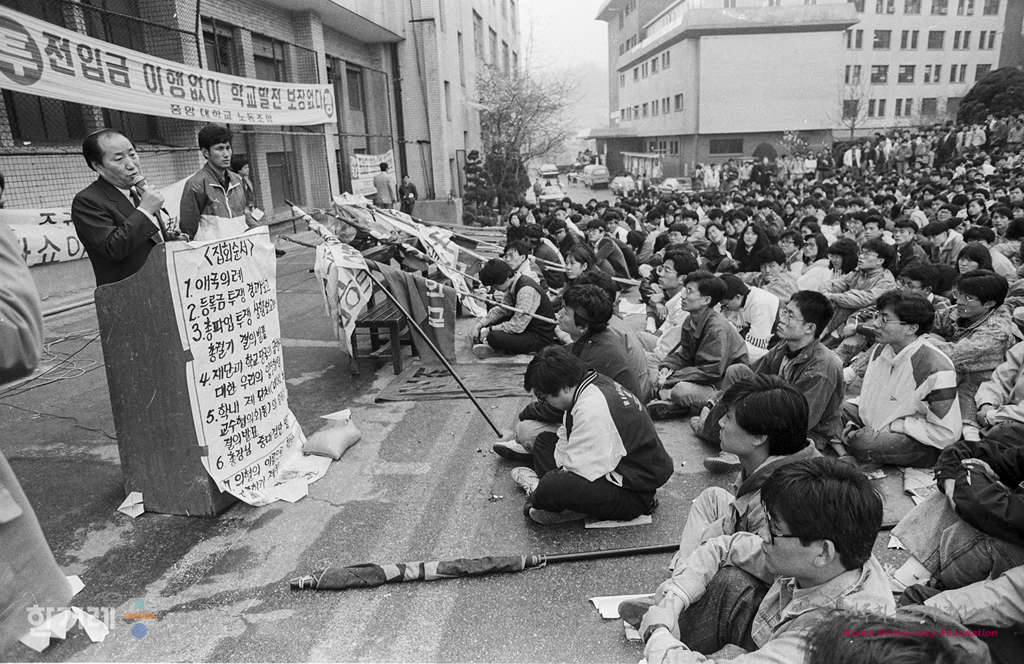 - 1990년 4월 3일 오후3시 중앙대생 1천여명은 교내 민주광장에서 등록금투쟁 승리를 위한 결의대회를 열고 89년 학교이전을 전제로 한 공약금 45억원 중 25억원이 지급하지 않아 전입금을 전제로 책정된 학교재정이 난관이 빠졌다며 재단쪽에 책임이행을 요구하며 시위를 벌이고 있다.