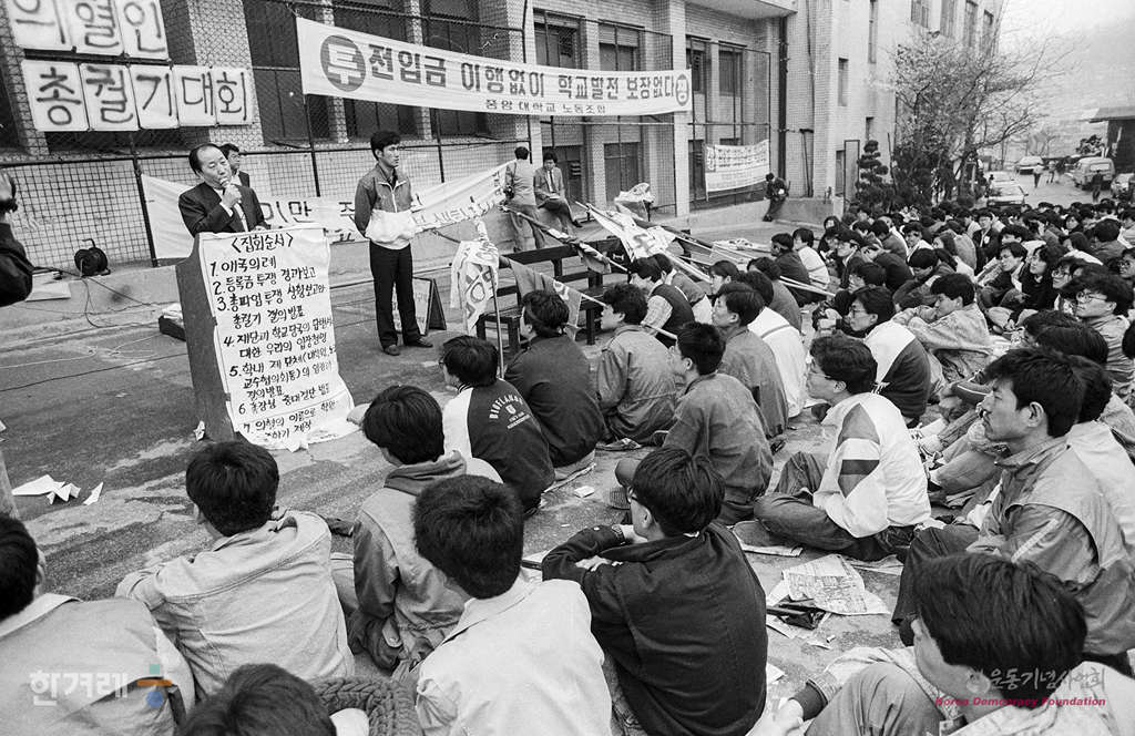 - 1990년 4월 3일 오후3시 중앙대생 1천여명은 교내 민주광장에서 등록금투쟁 승리를 위한 결의대회를 열고 89년 학교이전을 전제로 한 공약금 45억원 중 25억원이 지급하지 않아 전입금을 전제로 책정된 학교재정이 난관이 빠졌다며 재단쪽에 책임이행을 요구하며 시위를 벌이고 있다.