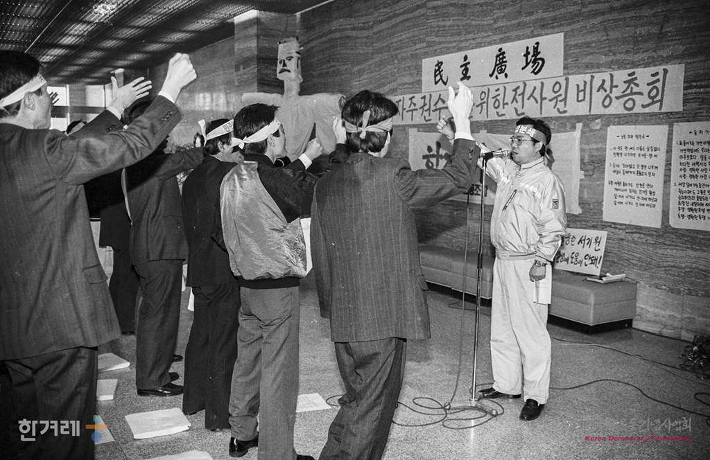 - 1990년 4월 3일 오전 11시 한국방송공사 사원 3백여명은 서울 여의도 KBS본관 중앙홀에서 서기원씨의 사장 취임을 반대하는 결의문을 채택하는 비상사원총회를 열고 있다.