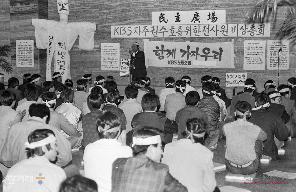 - 1990년 4월 3일 오전 11시 한국방송공사 사원 3백여명은 서울 여의도 KBS본관 중앙홀에서 서기원씨의 사장 취임을 반대하는 결의문을 채택하는 비상사원총회를 열고 있다.