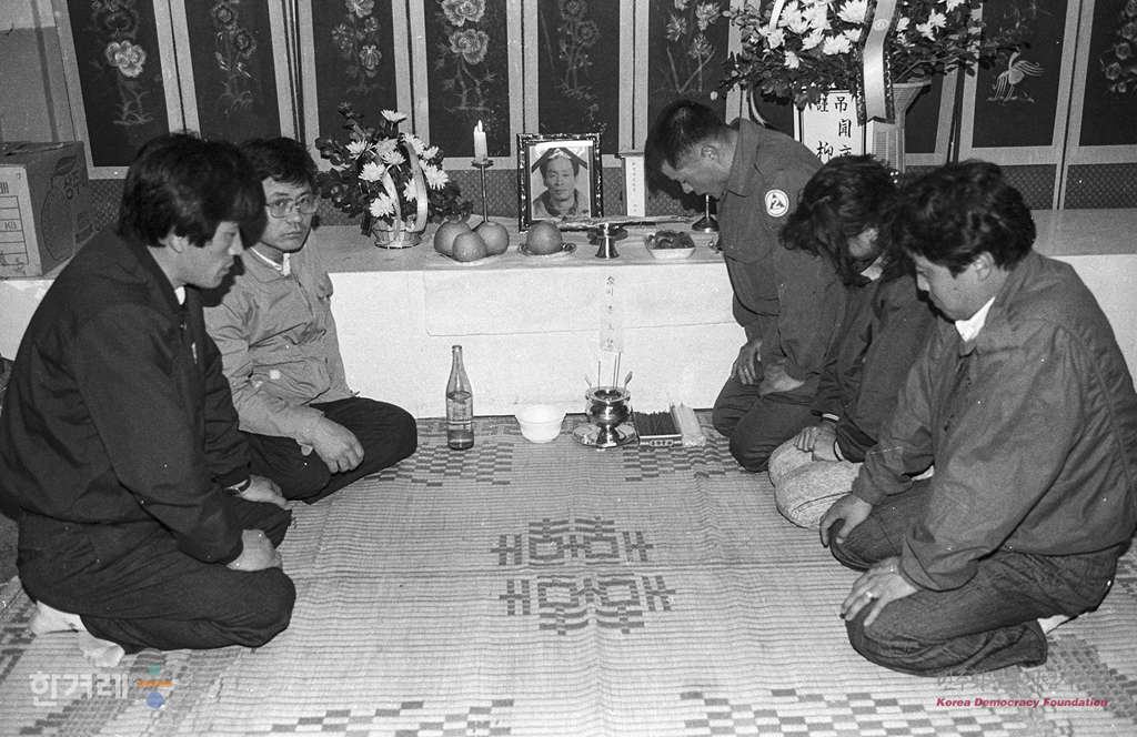 - 1990년 4월 5일 진폐증에 걸려 요양치료를 받던 중 신병을 비관 스스로 목숨을 끊은 이용호씨의 빈소가 마련된 경북 점촌시 문경병원 장례식장에 이씨의 가족들이 조문객을 맞고 있다.