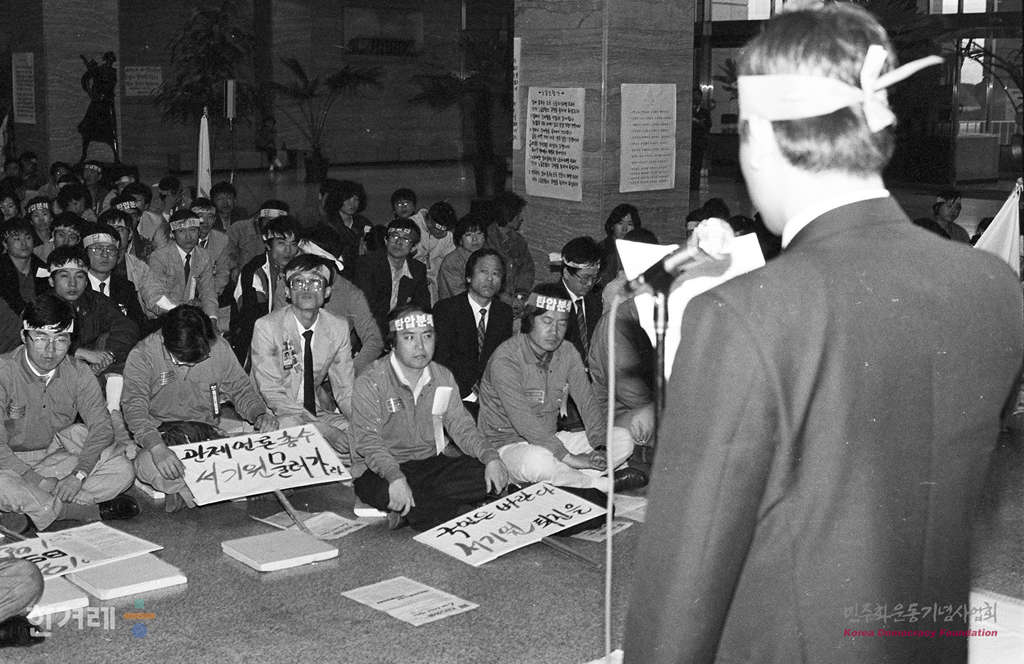- 1990년 4월 7일 한국방송공사 노동조합 조합원들이 KBS 민주광장에서 정부의 압력으로 사퇴한 서영훈 전 사장이 후임으로 지난 3일 내정된 서기원사장의 출근을 저지하는 관제사장 출근저지대 발대식에 앞서 노동조합 안동수 위원장이 삭발식을 하고 있다.