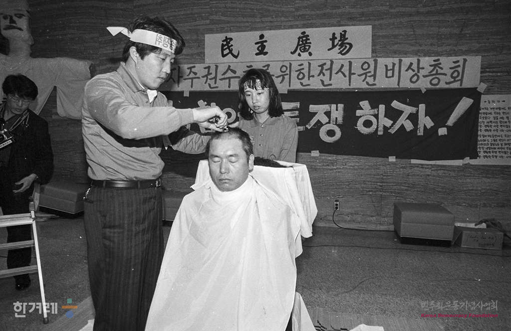 - 1990년 4월 7일 한국방송공사 노동조합 조합원들이 KBS 민주광장에서 정부의 압력으로 사퇴한 서영훈 전 사장이 후임으로 지난 3일 내정된 서기원사장의 출근을 저지하는 관제사장 출근저지대 발대식에 앞서 노동조합 안동수 위원장이 삭발식을 하고 있다.