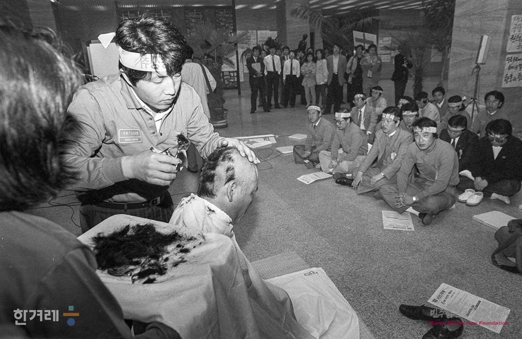 - 1990년 4월 7일 한국방송공사 노동조합 조합원들이 KBS 민주광장에서 정부의 압력으로 사퇴한 서영훈 전 사장이 후임으로 지난 3일 내정된 서기원사장의 출근을 저지하는 관제사장 출근저지대 발대식에 앞서 노동조합 안동수 위원장이 삭발식을 하고 있다.