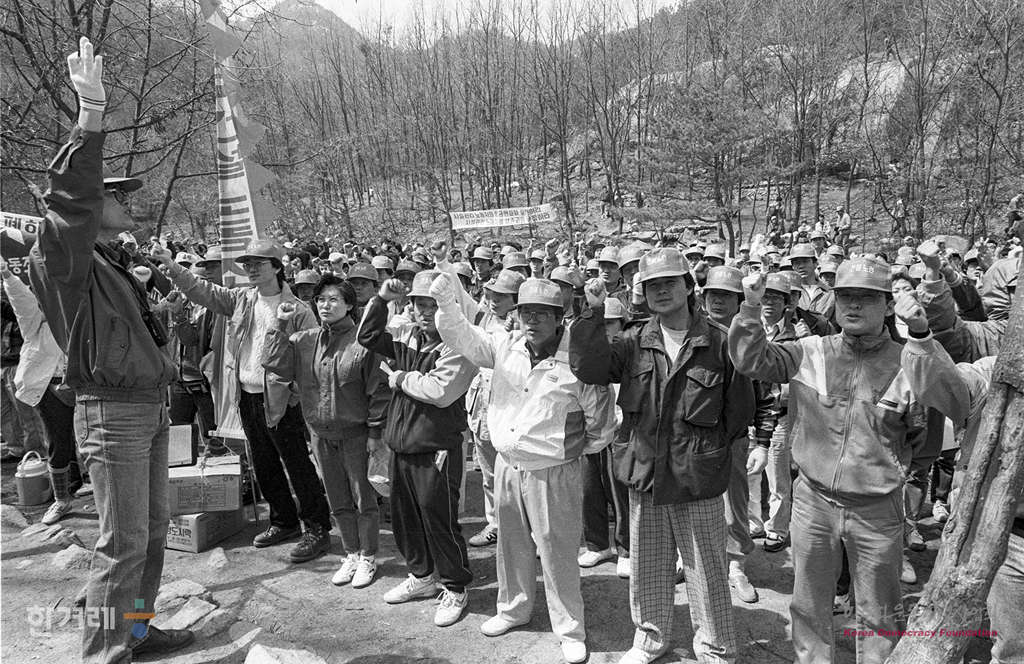 - 1990년 4월 8일 사무금융노련 병원노련 전문노련 전교조 건설노련 화물운송노련 등 13개 업종별 노조연합 소속 1천여명의 조합원들이 서울 관악산입구에서 노동운동탄압 분쇄 및 경제민주화를 위한 노동자등반대회에 앞서 약식집회를 하고 있다.