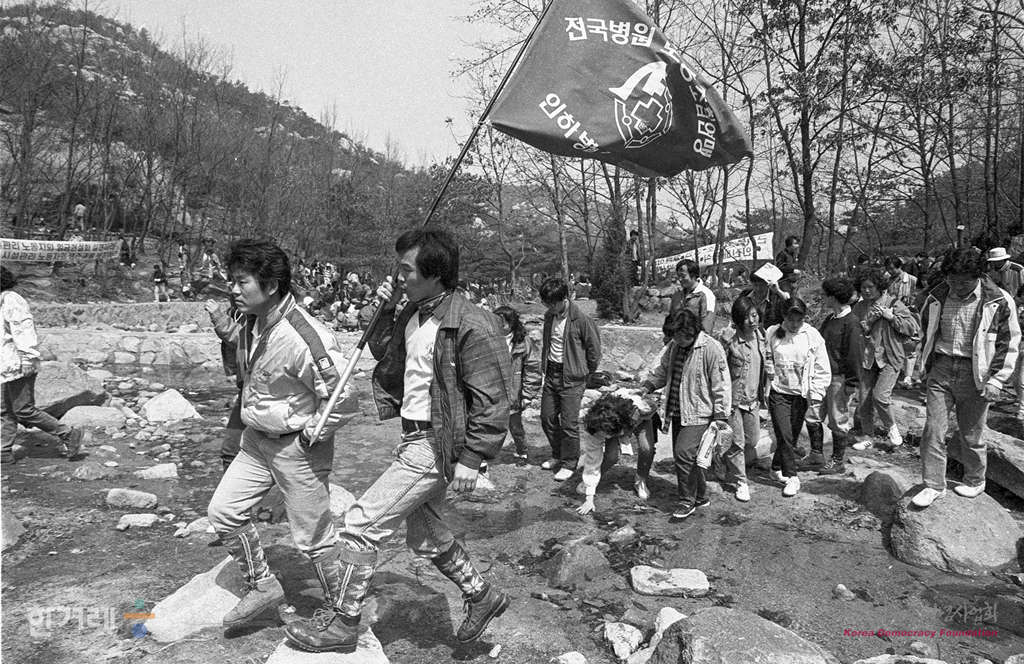 - 1990년 4월 8일 사무금융노련 병원노련 전문노련 전교조 건설노련 화물운송노련 등 13개 업종별 노조연합 소속 1천여명의 조합원들이 서울 관악산입구에서 노동운동탄압 분쇄 및 경제민주화를 위한 노동자등반대회에 앞서 약식집회를 하고 있다.