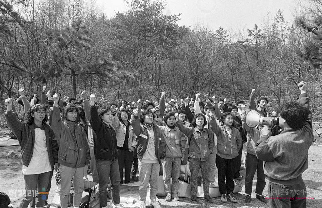 - 1990년 4월 8일 사무금융노련 병원노련 전문노련 전교조 건설노련 화물운송노련 등 13개 업종별 노조연합 소속 1천여명의 조합원들이 서울 관악산입구에서 노동운동탄압 분쇄 및 경제민주화를 위한 노동자등반대회에 앞서 약식집회를 하고 있다.
