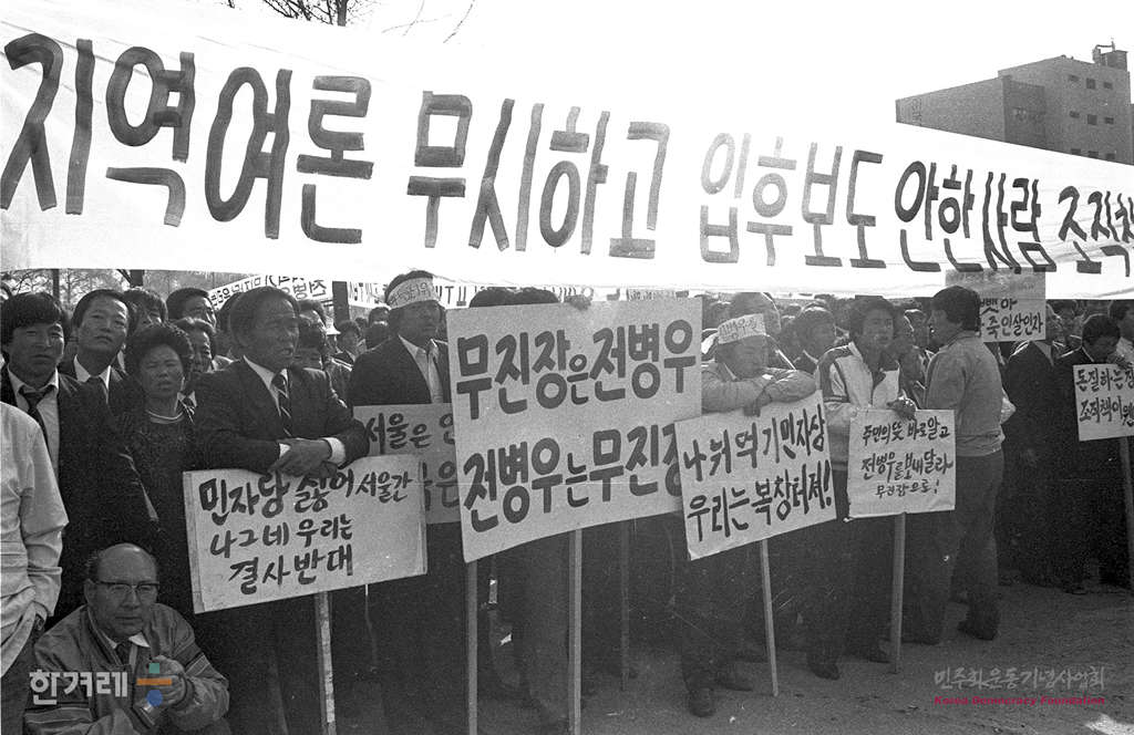 - 1990년 4월 6일 3당통합 이후 거대여당과 소수야당으로 뒤바뀐 정국구도에서 치러진 지난 4,3보궐선거에서 민주당 후보의 선전으로 당선된 이후 서울 여의도 민자당사앞에서 무주 진안 장수지역 정병우위원장을 지지하는 주민들이 지도부를 비난하며 시위를 벌이고 있다.
