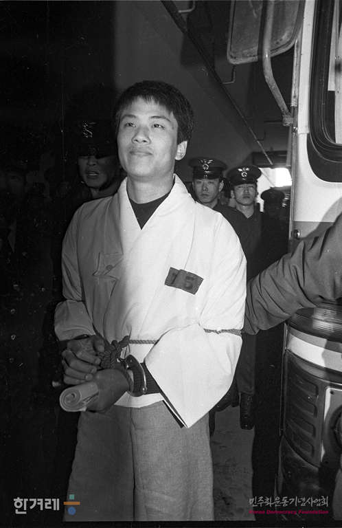 - 1990년 4월 9일 평양축전 관련 국가보안법 위반혐의로 구속기소된 전 전대협의장 임종석씨가 4차공판을 하기 위해 재판장으로 입장하고 있다.