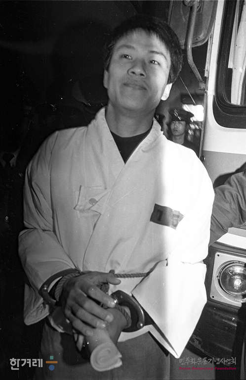 - 1990년 4월 9일 평양축전 관련 국가보안법 위반혐의로 구속기소된 전 전대협의장 임종석씨가 4차공판을 하기 위해 재판장으로 입장하고 있다.