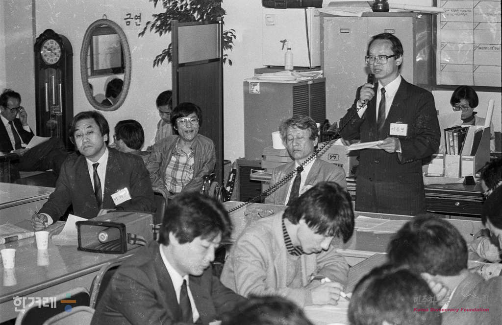 - 1990년 4월 10일 민중의 정당 건설을 위한 민주연합 추진위( 민연추) 준비모임은 서울 서교동사무실에서 전체회의를 열고 있다.