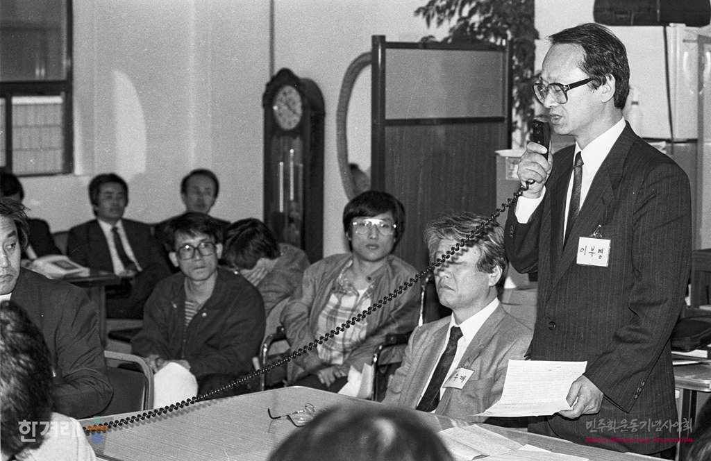 - 1990년 4월 10일 민중의 정당 건설을 위한 민주연합 추진위( 민연추) 준비모임은 서울 서교동사무실에서 전체회의를 열고 있다.