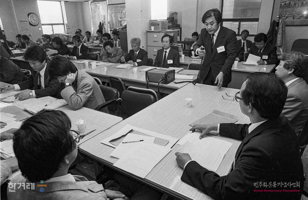 - 1990년 4월 10일 민중의 정당 건설을 위한 민주연합 추진위( 민연추) 준비모임은 서울 서교동사무실에서 전체회의를 열고 있다.