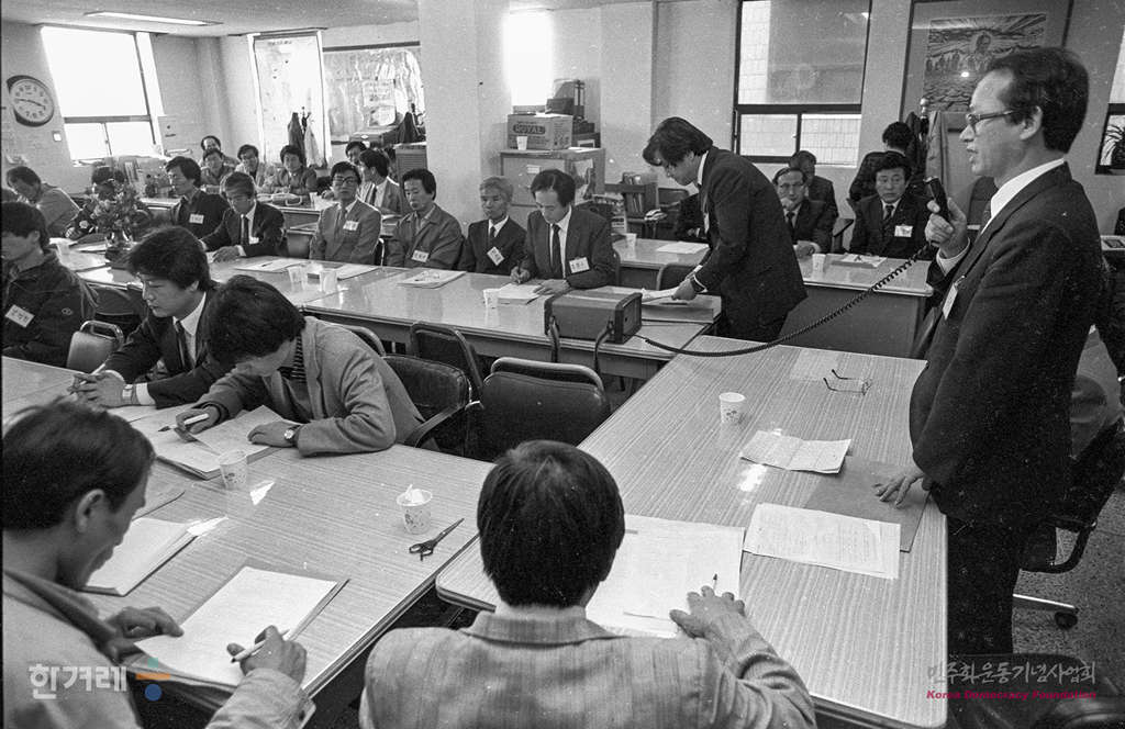 - 1990년 4월 10일 민중의 정당 건설을 위한 민주연합 추진위( 민연추) 준비모임은 서울 서교동사무실에서 전체회의를 열고 있다.