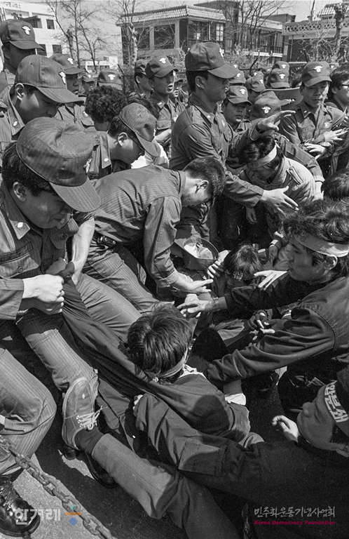 - 1990년 4월 10일 노동운동탄압 저지를 위한 노상기도회가 서울 구로1공단 대한광학 정문앞에서 열려 목회자와 노동자 등 50여명이 기도회를 갖던 중 경찰이 기도회를 중단하기 위해 참석자들을 연행하고 있다.