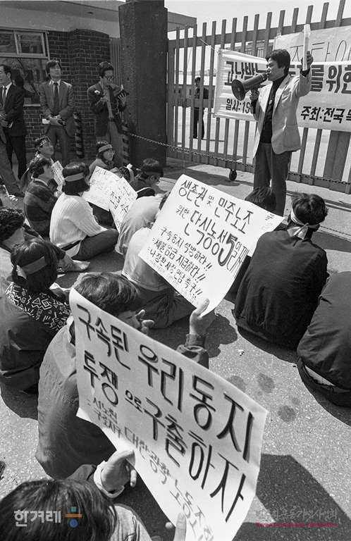 - 1990년 4월 10일 노동운동탄압 저지를 위한 노상기도회가 서울 구로1공단 대한광학 정문앞에서 열려 목회자와 노동자 등 50여명이 기도회를 갖던 중 경찰이 기도회를 중단하기 위해 참석자들을 연행하고 있다.
