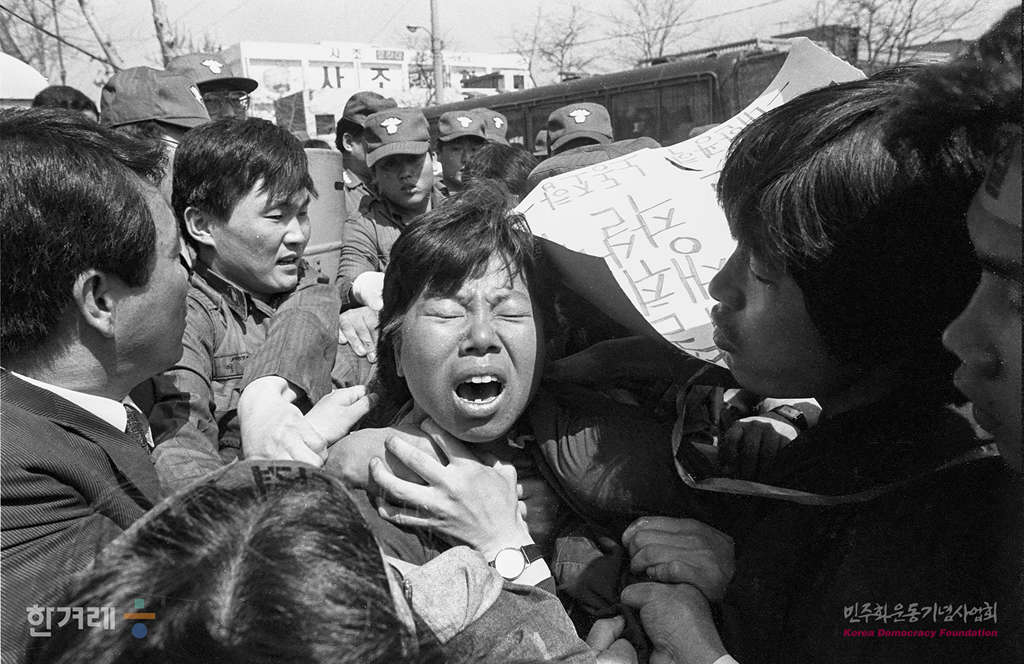 - 1990년 4월 10일 노동운동탄압 저지를 위한 노상기도회가 서울 구로1공단 대한광학 정문앞에서 열려 목회자와 노동자 등 50여명이 기도회를 갖던 중 경찰이 기도회를 중단하기 위해 참석자들을 연행하고 있다.