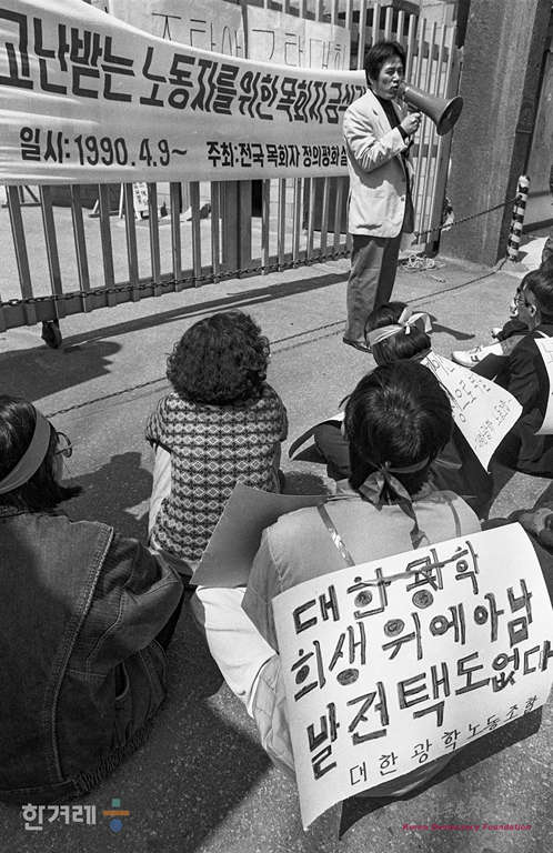 - 1990년 4월 10일 노동운동탄압 저지를 위한 노상기도회가 서울 구로1공단 대한광학 정문앞에서 열려 목회자와 노동자 등 50여명이 기도회를 갖던 중 경찰이 기도회를 중단하기 위해 참석자들을 연행하고 있다.