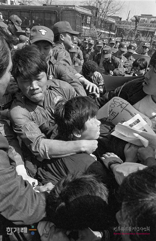 - 1990년 4월 10일 노동운동탄압 저지를 위한 노상기도회가 서울 구로1공단 대한광학 정문앞에서 열려 목회자와 노동자 등 50여명이 기도회를 갖던 중 경찰이 기도회를 중단하기 위해 참석자들을 연행하고 있다.