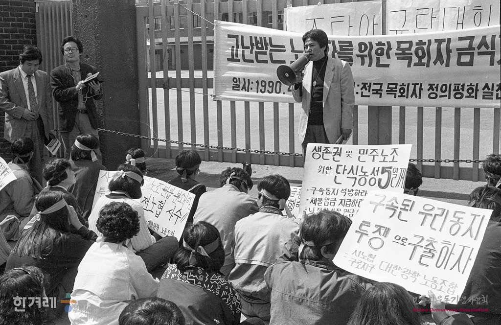 - 1990년 4월 10일 노동운동탄압 저지를 위한 노상기도회가 서울 구로1공단 대한광학 정문앞에서 열려 목회자와 노동자 등 50여명이 기도회를 갖던 중 경찰이 기도회를 중단하기 위해 참석자들을 연행하고 있다.