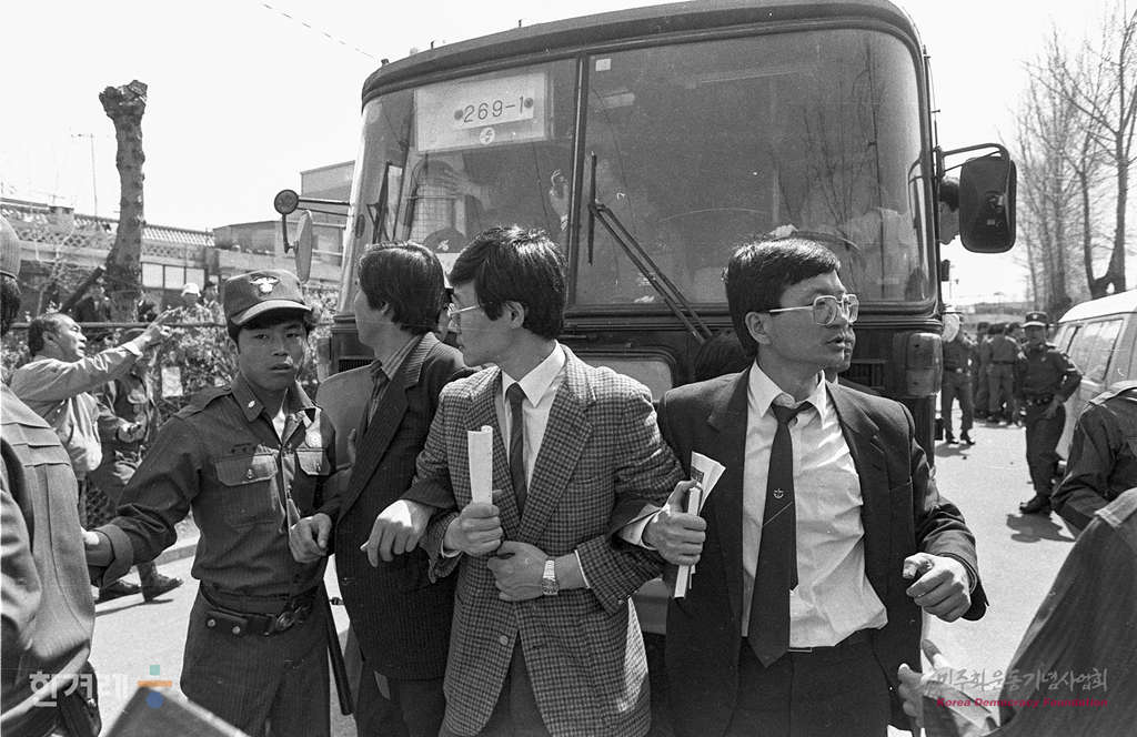 - 1990년 4월 10일 노동운동탄압 저지를 위한 노상기도회가 서울 구로1공단 대한광학 정문앞에서 열려 목회자와 노동자 등 50여명이 기도회를 갖던 중 경찰이 기도회를 중단하기 위해 참석자들을 연행하고 있다.