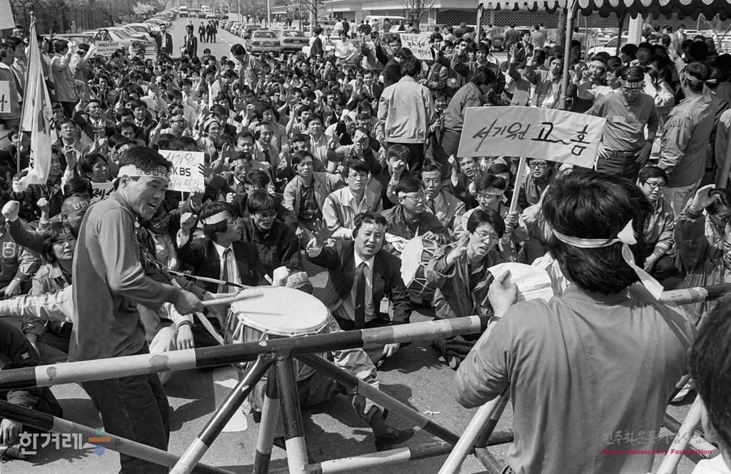 - 1990년 4월 11일 한국방송공사 사장으로 임명된 서기원씨가 첫 출근을 하기 위해 청원경찰과 간부들에게 둘러사여 본관 정문으로 들어가려다 노조원들에게 저기당하고 있다. 서씨는 이날 오후 자신의 취임에 반대하는 노조원들을 피해 한국방송공사 본관 6층 사장실로 기습 출근했으나 50분만에 노조원들에 의해 밖으로 밀려났다.