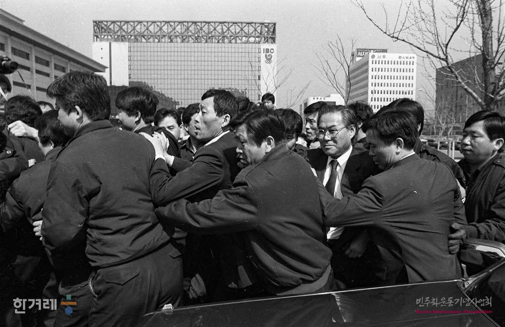 - 1990년 4월 11일 한국방송공사 사장으로 임명된 서기원씨가 첫 출근을 하기 위해 청원경찰과 간부들에게 둘러사여 본관 정문으로 들어가려다 노조원들에게 저기당하고 있다. 서씨는 이날 오후 자신의 취임에 반대하는 노조원들을 피해 한국방송공사 본관 6층 사장실로 기습 출근했으나 50분만에 노조원들에 의해 밖으로 밀려났다.