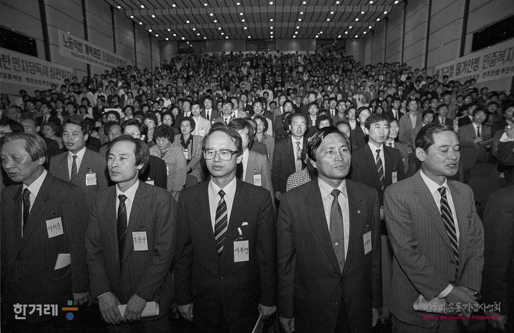 - 1990년 4월 13일 민중의 정당건설을 위한 민주연합 추진위원회(민연추) 결성대회가 서울 삼성동 한국종합전시장에서 열려 민중의 정치세력화와 자주 민주 통일의 역사적 과업을 달성할 것을 선언하고 있다. 이날 결성대회에서 고영구 백기완 이우재씨가 공동대표가 됐다.