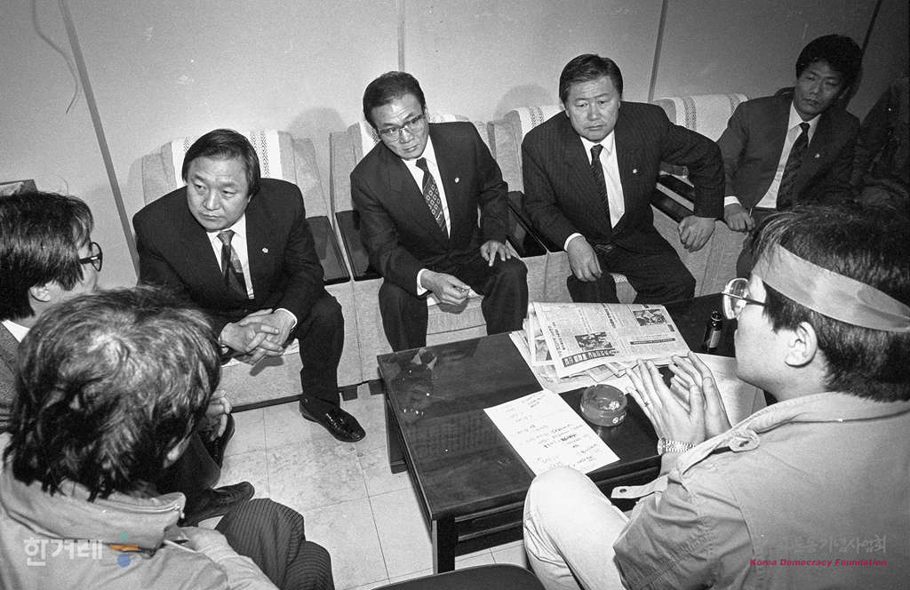 - 1990년 4월 13일 경찰의 대규모 난입으로 한국방송공사의 무기한 제작거부사태를 빗고 있는 가운데 정대철의원을 비롯한 평민당 조사단이 한국방송공사 노조사무실에서 사태에 대한 상황설명을 듣고 있다.