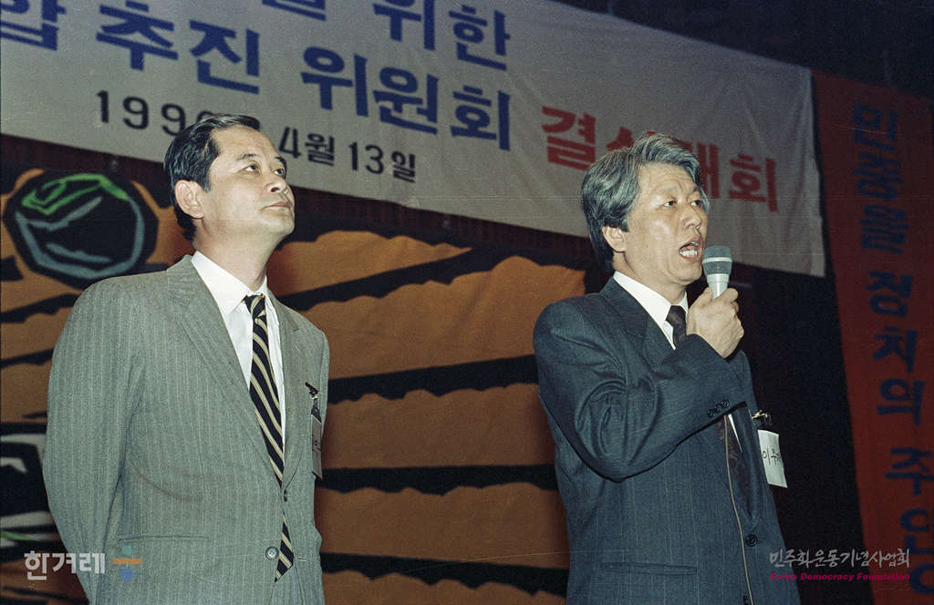 - 1990년 4월 13일 민중의 정당건설을 위한 민주연합 추진위원회(민연추) 결성대회가 서울 삼성동 한국종합전시장에서 열려 민중의 정치세력화와 자주 민주 통일의 역사적 과업을 달성할 것을 선언하고 있다. 이날 결성대회에서 고영구 백기완 이우재씨가 공동대표가 됐다.