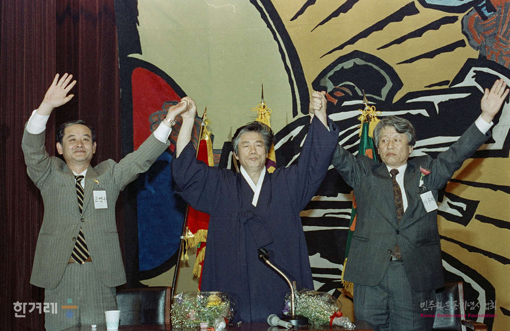 - 1990년 4월 13일 민중의 정당건설을 위한 민주연합 추진위원회(민연추) 결성대회가 서울 삼성동 한국종합전시장에서 열려 민중의 정치세력화와 자주 민주 통일의 역사적 과업을 달성할 것을 선언하고 있다. 이날 결성대회에서 고영구 백기완 이우재씨가 공동대표가 됐다.