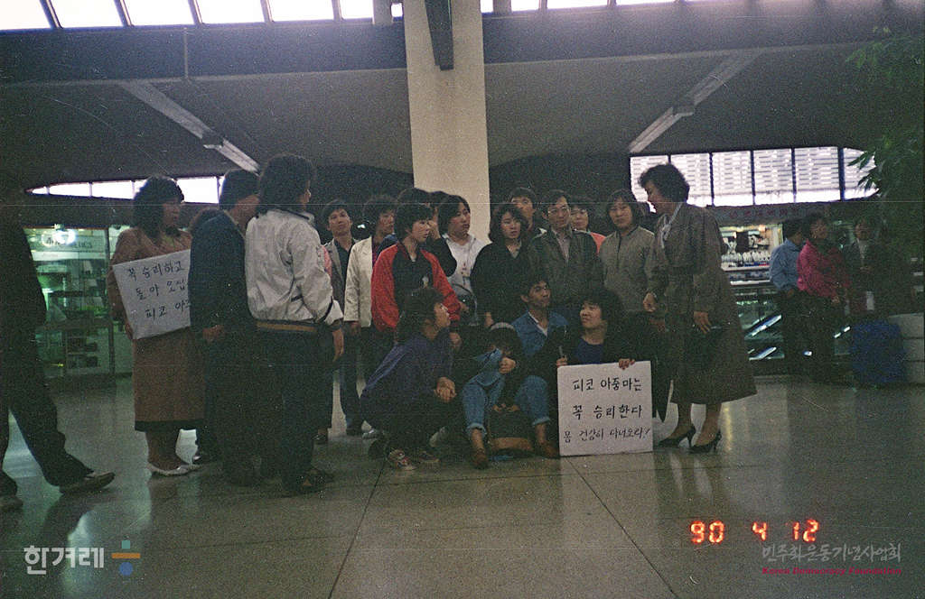 - 1990년 4월 12일 한국피코 노조위원장 유점순씨 등 노조간부 3명이 임금을 체불한 채 철수해보린 미국 본사 버나드 히치코크 회장과 담판을 벌이기 위해 김포공항에서 떠나기 앞서 마중나온 노조원들과 기념촬영을 하고 있다.