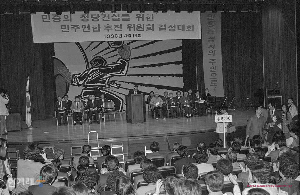 - 1990년 4월 13일 민중의 정당건설을 위한 민주연합 추진위원회(민연추) 결성대회가 서울 삼성동 한국종합전시장에서 열려 민중의 정치세력화와 자주 민주 통일의 역사적 과업을 달성할 것을 선언하고 있다. 이날 결성대회에서 고영구 백기완 이우재씨가 공동대표가 됐다.