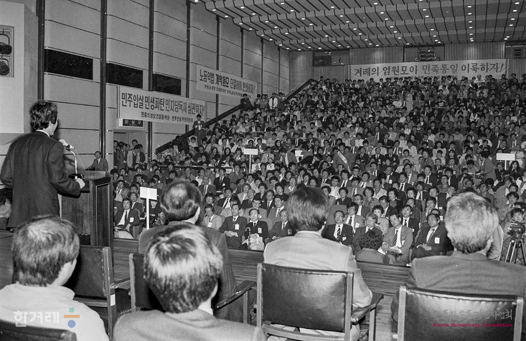 - 1990년 4월 13일 민중의 정당건설을 위한 민주연합 추진위원회(민연추) 결성대회가 서울 삼성동 한국종합전시장에서 열려 민중의 정치세력화와 자주 민주 통일의 역사적 과업을 달성할 것을 선언하고 있다. 이날 결성대회에서 고영구 백기완 이우재씨가 공동대표가 됐다.