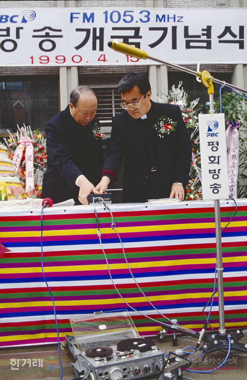 - 1990년 4월 15일 11시 김옥균 재단이사장과 조덕현 사장이천주교 관계자와 사원 등 2백여명이 지켜보는 가운데 서울 중구 저동1가 평화방송사옥에서 전파발사 버튼을 누르며 평화방송 ( PBS FM 105.3MHz )개국을 알리고 있다.