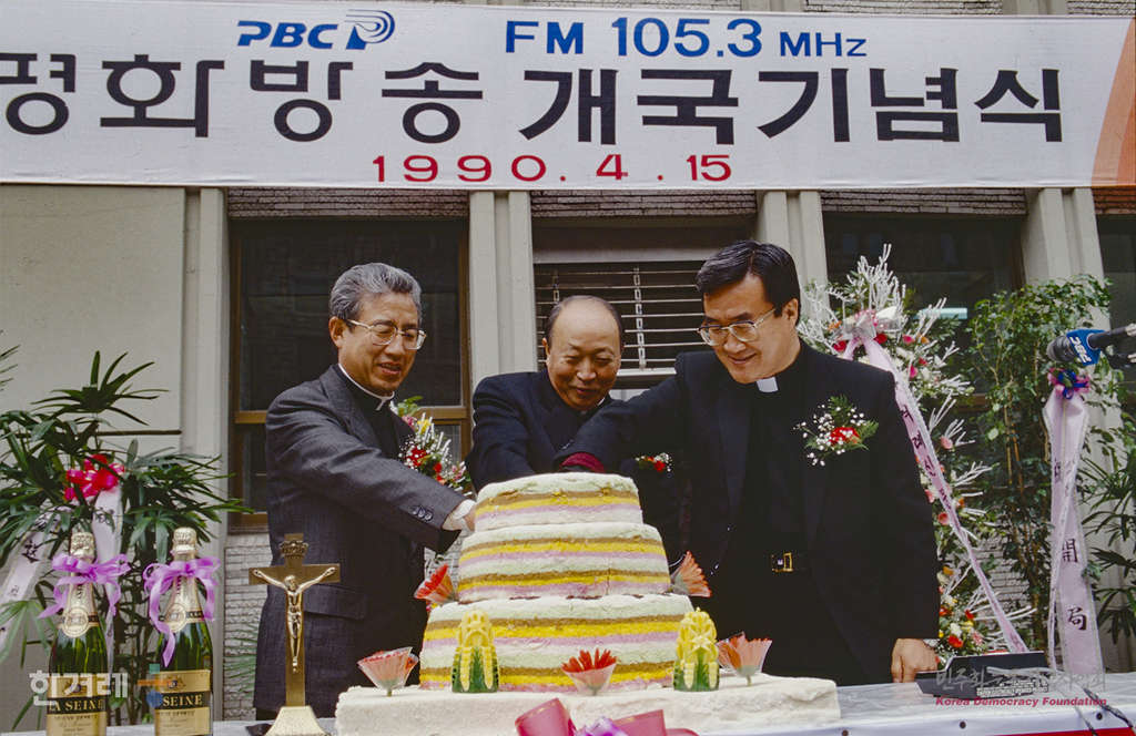 - 1990년 4월 15일 11시 김옥균 재단이사장과 조덕현 사장이천주교 관계자와 사원 등 2백여명이 지켜보는 가운데 서울 중구 저동1가 평화방송사옥에서 전파발사 버튼을 누르며 평화방송 ( PBS FM 105.3MHz )개국을 알리고 있다.