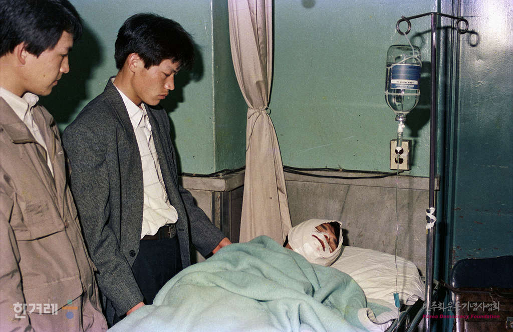 - 1990년 4월 13일 오후6시 10분 광주시 용봉동 전남대에서 경찰의 학교안 진입에 항의하며 시위를 벌이다 경찰에 쏜 직격최루탄에 얼굴을 맞아 앞니 10개와 턱뼈기 부러지는 중상을 입고 전남대병원에서 치료를 받고 있는 유석씨가 온 얼굴에 붕대를 감고 누워있다.