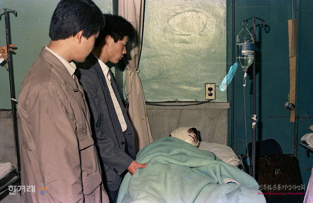 - 1990년 4월 13일 오후6시 10분 광주시 용봉동 전남대에서 경찰의 학교안 진입에 항의하며 시위를 벌이다 경찰에 쏜 직격최루탄에 얼굴을 맞아 앞니 10개와 턱뼈기 부러지는 중상을 입고 전남대병원에서 치료를 받고 있는 유석씨가 온 얼굴에 붕대를 감고 누워있다.